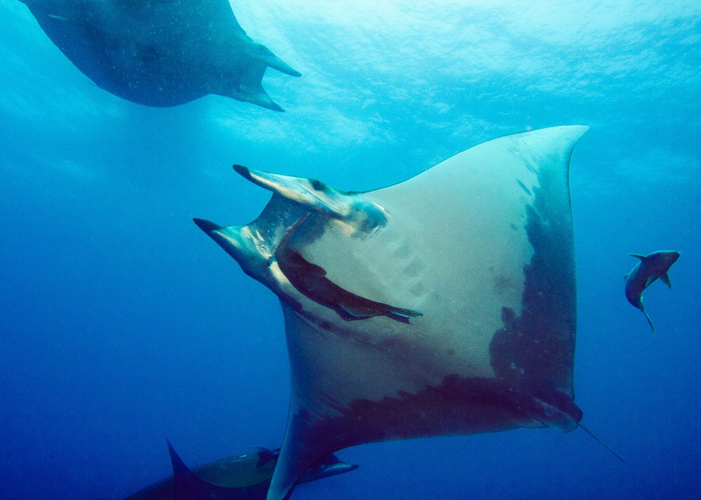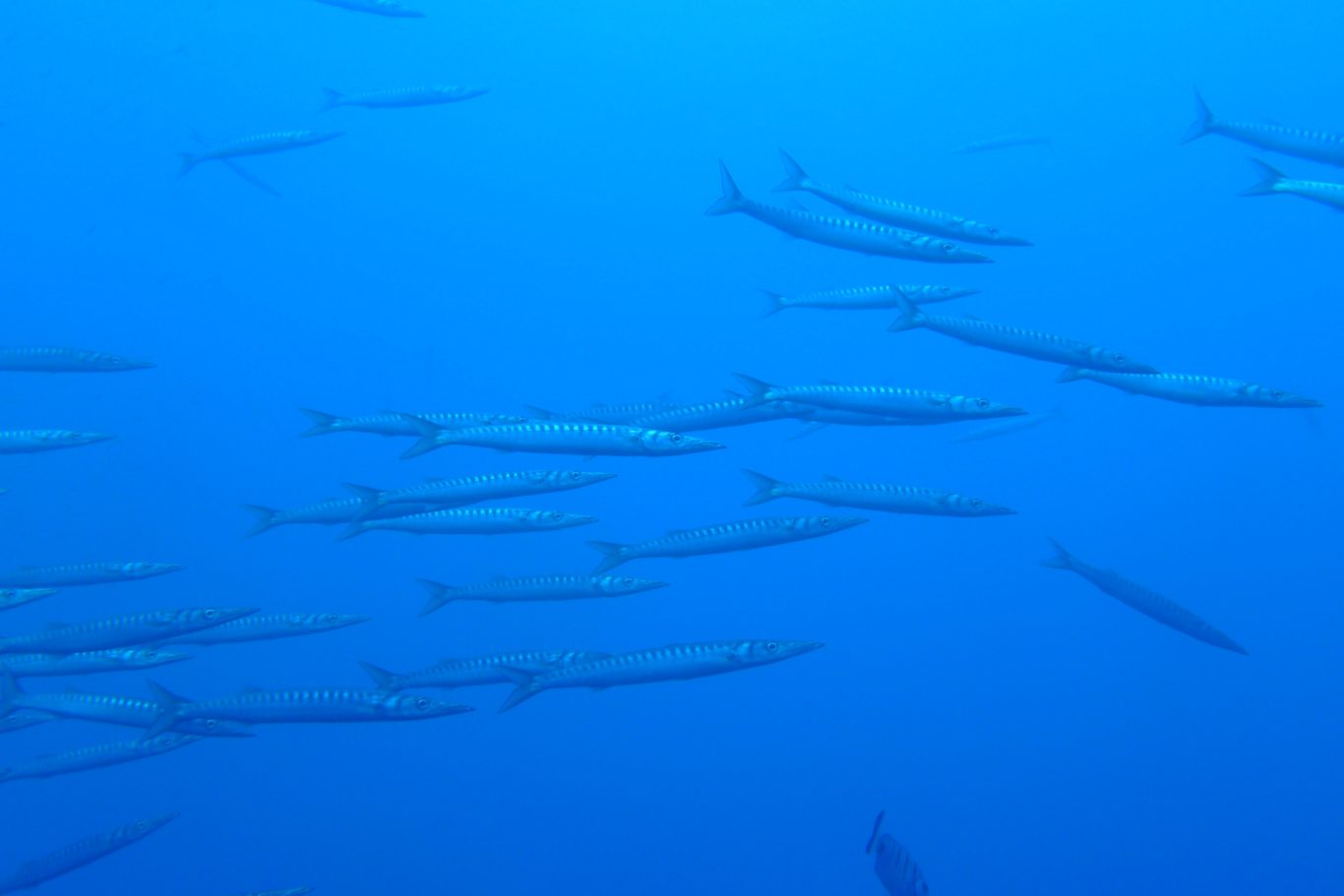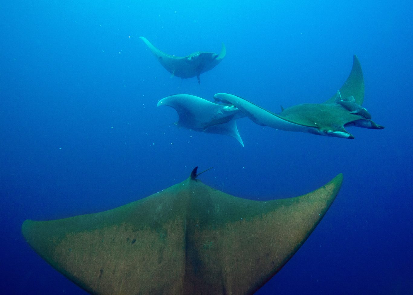 Dort ging es täglich mit einem Zodiac auf die Suche nach den besten Tauchplätzen des Tages. Wo sind sie, die Mobulas. Ein spannender Moment, vor jedem Abtauchen. Und dann, wir hatten Glück. Unter Wasser erwartete uns das absolute Highlight: Mobulas! Diese majestätischen Rochen schwebten fast schwerelos im endlosen Blauwasser – ein Anblick, der uns allen den Atem raubte. Wie hypnotisiert hielten wir uns am Seil fest, um nicht von der Strömung (oder der eigenen Begeisterung) mitgerissen zu werden. Plötzlich tauchte aus der Ferne ein Barrakuda-Schwarm auf – silbrig glänzend, blitzschnell, eindrucksvoll. Und dank Michaels perfektem Lichtspiel erstrahlte die Szene in magischem Glanz – ein Moment, den keiner von uns je vergessen wird.