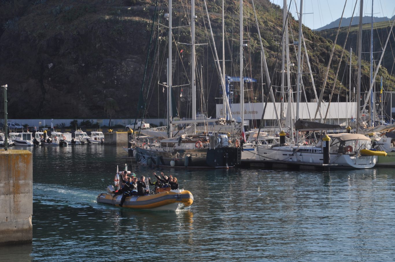 Die Tauchbasis Haliotes war ein perfekter Ausgangspunkt. Das Team begrüßte uns herzlich, alles war professionell und unkompliziert organisiert. Morgens gingen wir zu Fuß zum Hafen, wo das Schlauchboot wartete. Die 20-25-minütige Fahrt zu den Tauchplätzen rund um Sao Vicente war jedes Mal ein kleines Abenteuer: der Atlantikwind peitschte über die Wellen, und wir hielten uns gut fest.