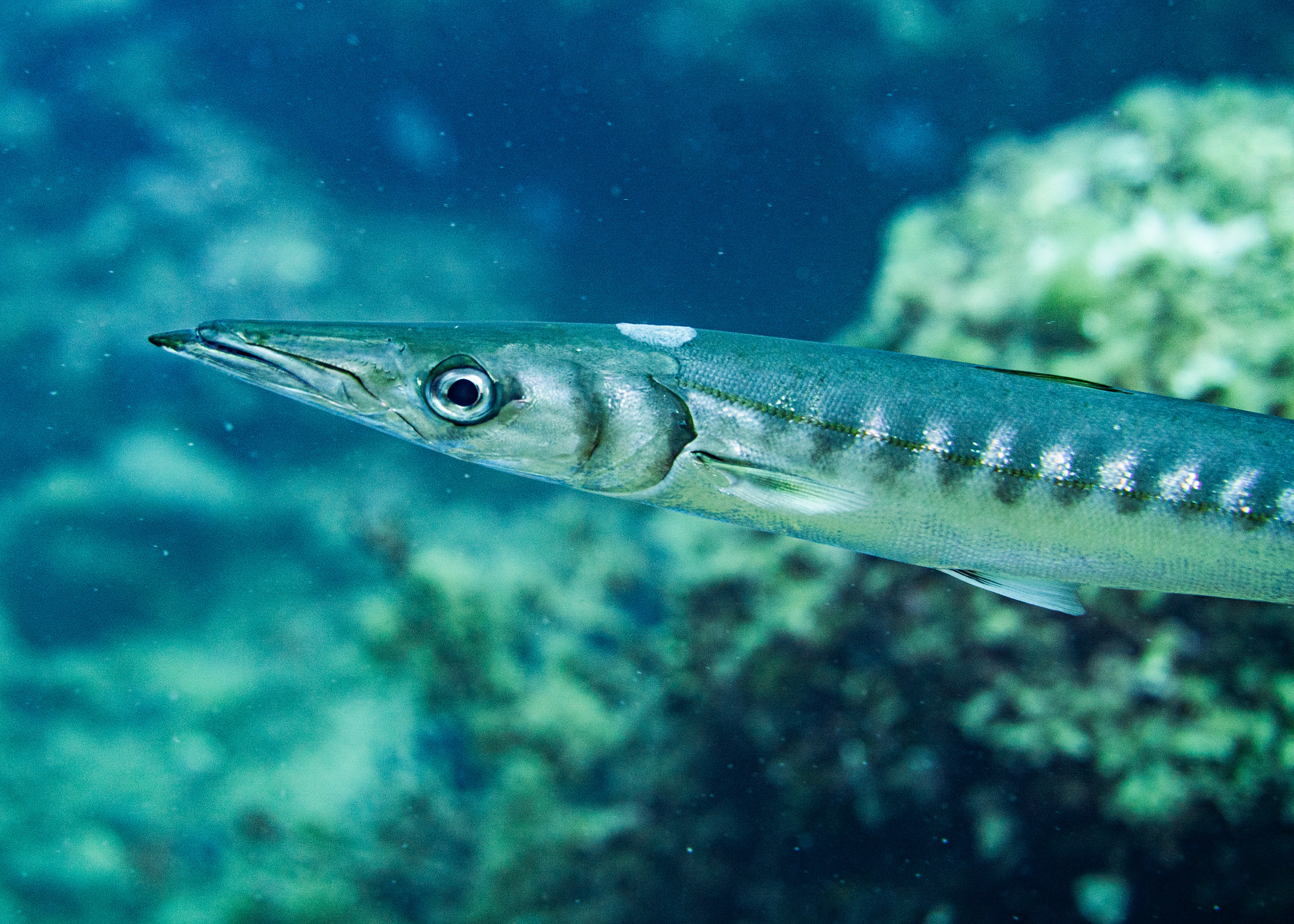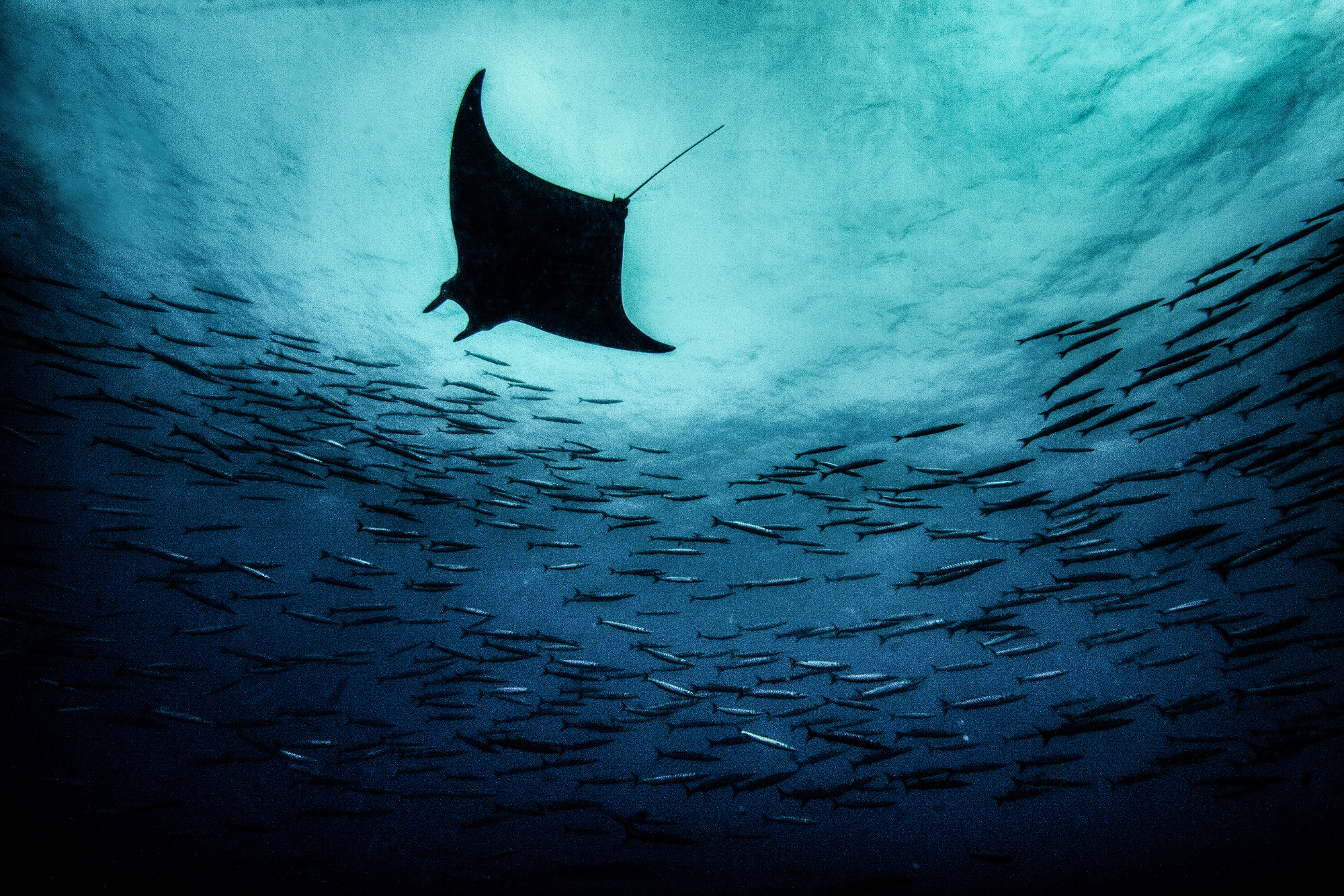 Dort ging es täglich mit einem Zodiac auf die Suche nach den besten Tauchplätzen des Tages. Wo sind sie, die Mobulas. Ein spannender Moment, vor jedem Abtauchen. Und dann, wir hatten Glück. Unter Wasser erwartete uns das absolute Highlight: Mobulas! Diese majestätischen Rochen schwebten fast schwerelos im endlosen Blauwasser – ein Anblick, der uns allen den Atem raubte. Wie hypnotisiert hielten wir uns am Seil fest, um nicht von der Strömung (oder der eigenen Begeisterung) mitgerissen zu werden. Plötzlich tauchte aus der Ferne ein Barrakuda-Schwarm auf – silbrig glänzend, blitzschnell, eindrucksvoll. Und dank Michaels perfektem Lichtspiel erstrahlte die Szene in magischem Glanz – ein Moment, den keiner von uns je vergessen wird.