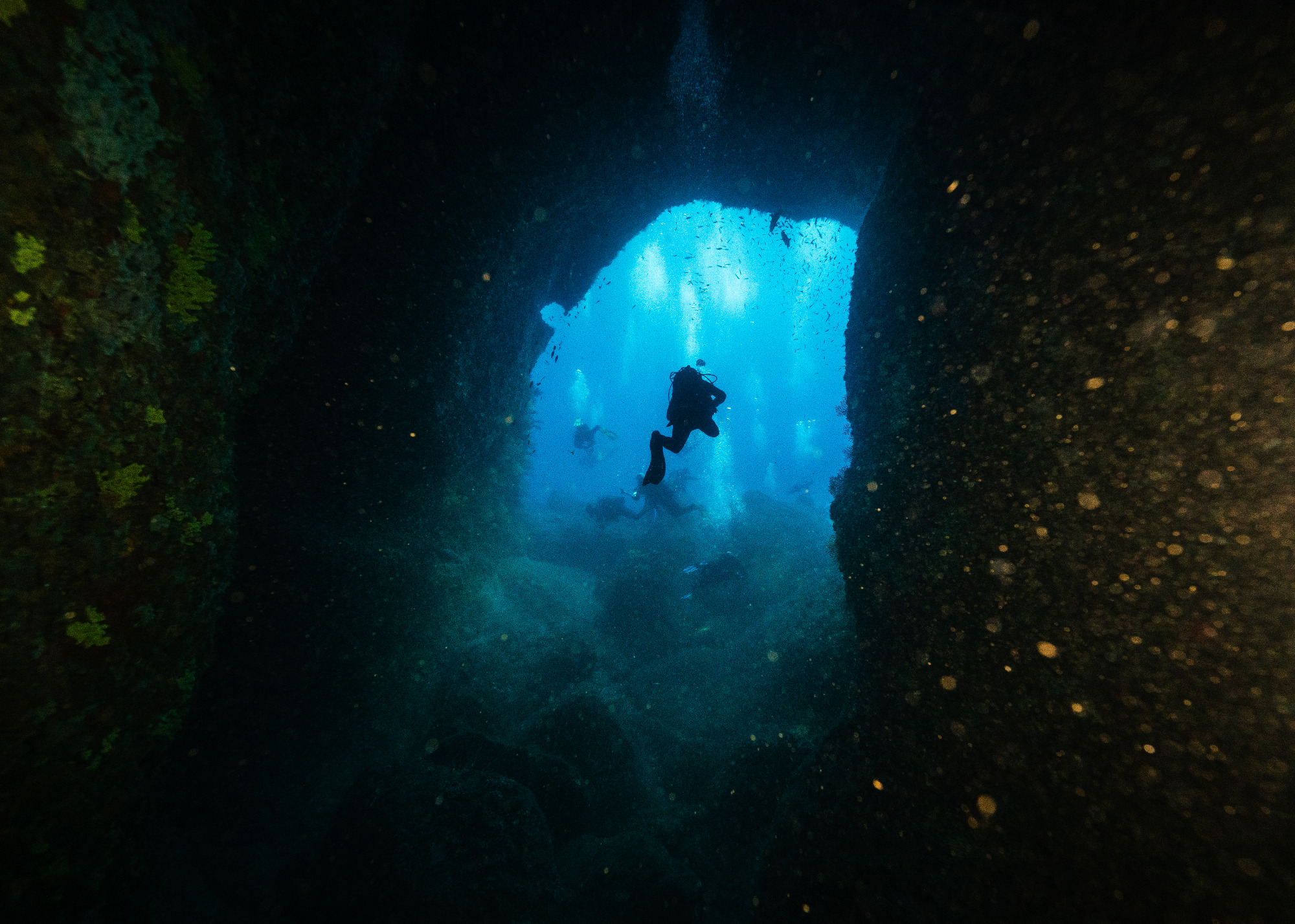 Besonders in Erinnerung geblieben sind uns die Höhlen. Schon beim Nähern entsteht ein leichtes Kribbeln, wenn das Licht von außen in die dunkleren Bereiche fällt und die Strukturen sichtbar werden, entsteht eine ganz besondere Atmosphäre. Für uns ist das Tauchen in Höhlen eine Mischung aus Abenteuer, Konzentration und stiller Schönheit.